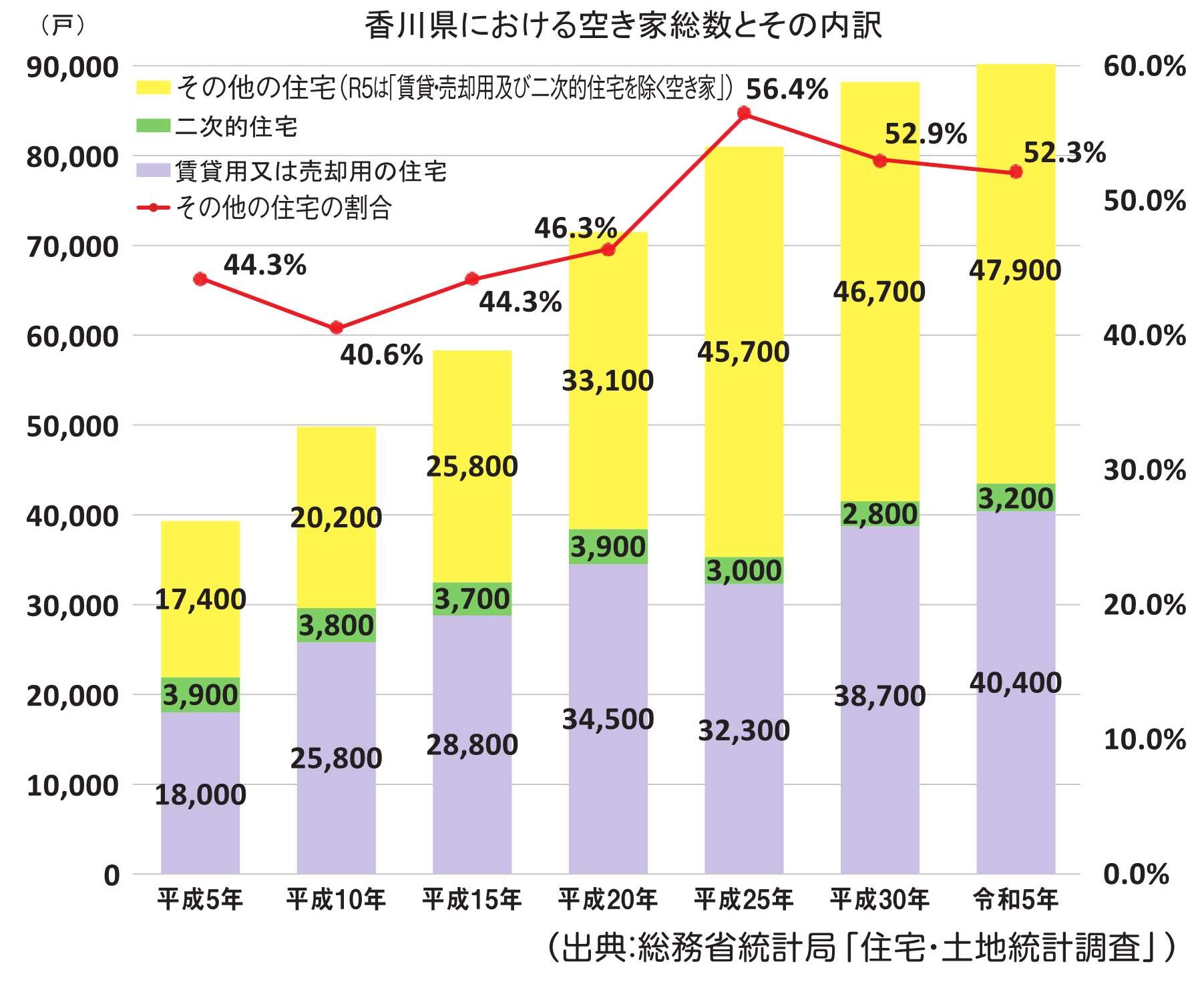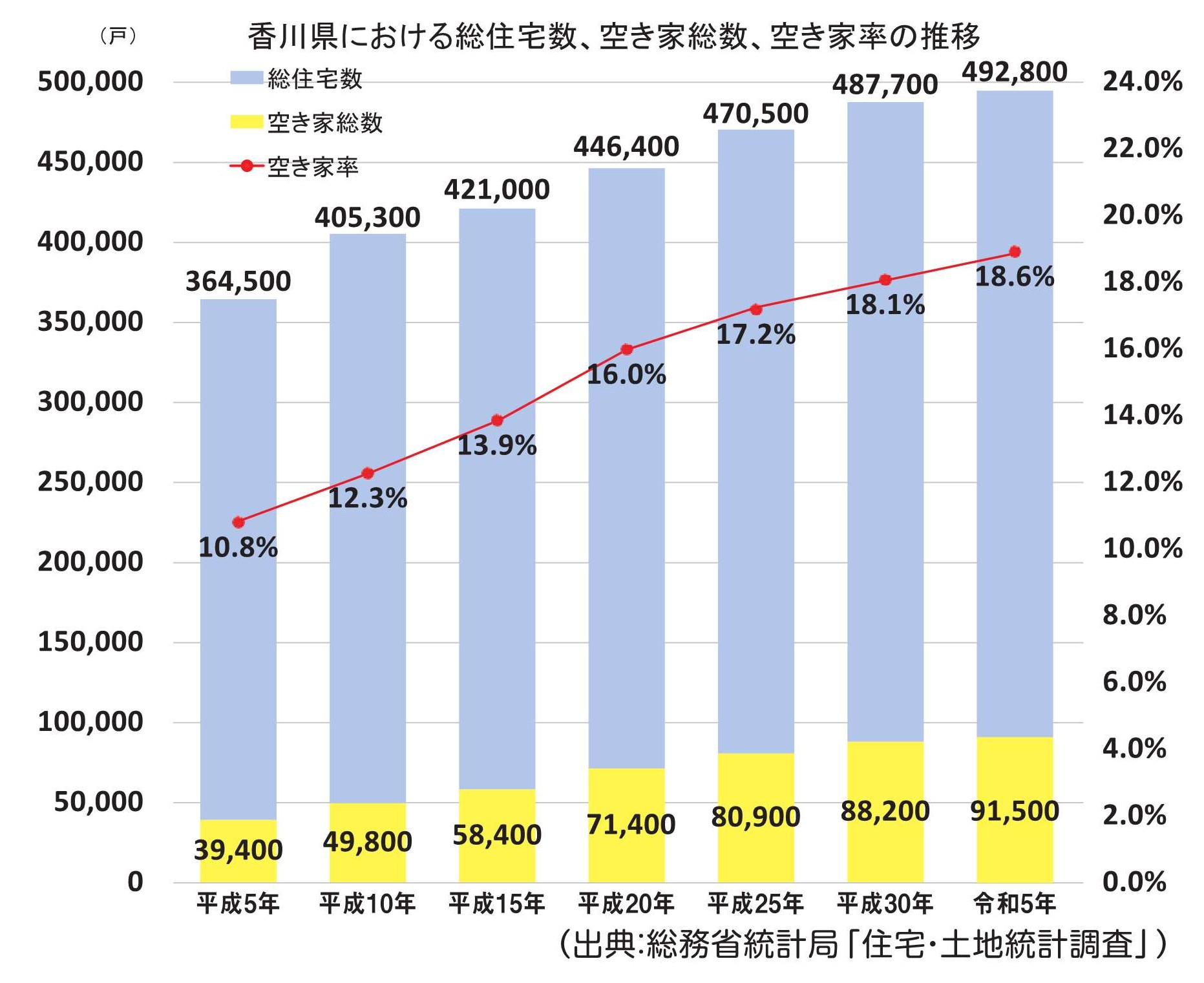 総務省の「住宅・土地統計調査」によると、香川県内の空き家は年々増え続けており、令和5年時点で、空き家総数は約9万1千5百戸となっています。総住宅数に占める空き家の割合は18.6%(全国平均は13.8%)となっており、これは全国で10番目に高い水準となっています。